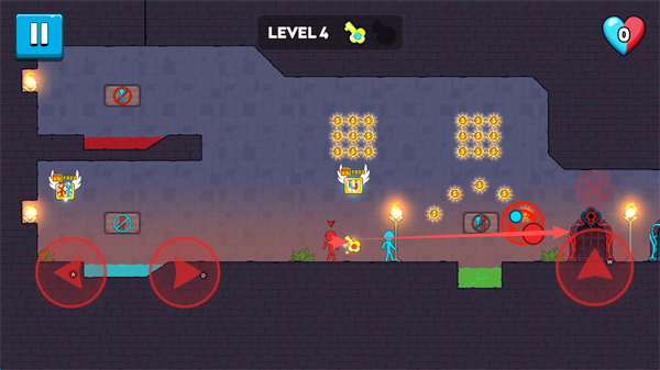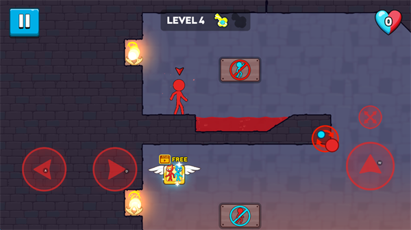 冰火火柴人双人版是一个以横版闯关为核心玩法的动作解谜类手游。游戏采用了经典的火柴人美术风格,整体画面简洁却色彩鲜明,视觉对比强烈且富有节奏感。某一天,两位性格迥异却关系密切的火柴人意外在森林中迷路,他们必须依靠彼此的力量,在危机四伏的环境中齐心协力,穿越充满陷阱与障碍的关卡,才能重新找到回家的道路。在游戏中,玩家将同时操控拥有冰与火属性的两位火柴人。火系火柴人能够穿越炙热的熔岩与火焰地形而安然无恙,而冰系火柴人则能轻松应对水流与冰冷环境的考验。两人相辅相成,只有通过精准的时机配合与合理的路线规划,才能顺利避开机关、突破重重陷阱,并找到通往下一个关卡的钥匙与大门。