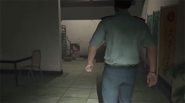 10、往右边蹲下过铁门来到教官室,看到教官在看电视,这里先别着急,等教官去查看电视的问题再移动。